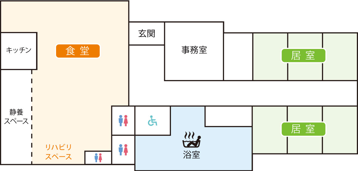 スタッフが常駐している安心な環境でご宿泊いただけます。デイサービスのご利用からそのまま続けてご宿泊いただくことも可能です。