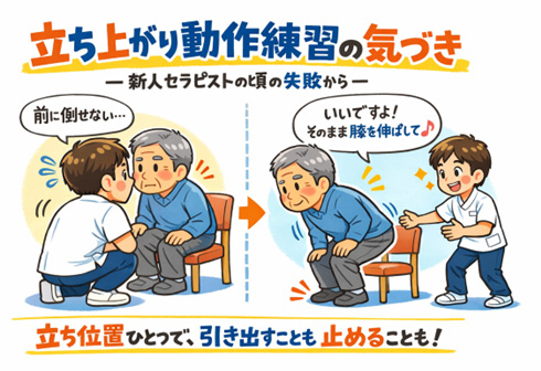 立ち上がり動作練習では、理学療法士・作業療法士が「なんとか立てる」レベルの患者さんに対して、